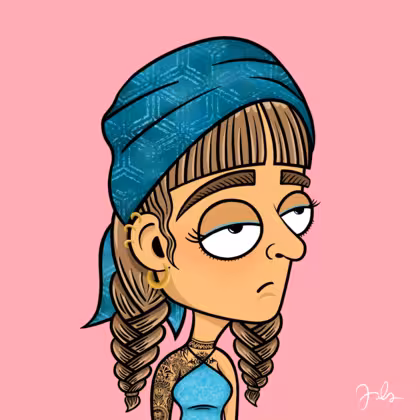 Collection Depressed Citizens Artist Juls Description ART. No team, no project, no future. Depressed Citizens is an urban & existential Art expression on Ordinals. In a parallel universe, "THEI" control us. DC unites against toxic society, encouraging critical thinking. 100% hand made collection that took Juls more than 6 months of daily work. Name Citizen#870 Origin Caucasian non hispanic Gender Woman Necklace No Necklace Hat Printed head scarf Mustache Beard No beard Glasses No Glasses Earrings Helix ring trio Hair Style Double braids with bangs Clothes Sky blue halterneck top Tattoo Maya tattoo Star Background Without stars